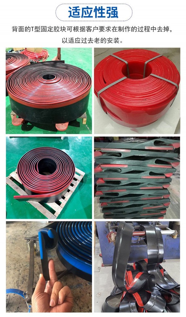 旁膠由帶狀橡膠板和底部的聚氨酯塊組成,聚氨酯塊通過熱硫化工藝與橡膠板緊密結(jié)合,能夠承受長(zhǎng)時(shí)間的摩擦而不與橡膠分離。這種結(jié)構(gòu)設(shè)計(jì)不僅提高了耐磨性,還確保了旁膠的使用壽命長(zhǎng),且不會(huì)損傷皮帶。