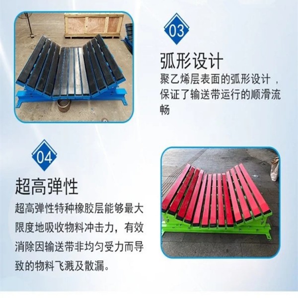緩沖條的表面材料UHMW-PE表面光滑耐磨,可減少摩擦阻力,延長(zhǎng)壽命。緩沖條的中層高彈性橡膠可有效減輕物料對(duì)皮帶的沖擊,從而降低物料對(duì)皮帶的沖擊。現(xiàn)場(chǎng)安裝維護(hù)簡(jiǎn)便,側(cè)床可調(diào)節(jié)角度或平放,整體可從膠帶機(jī)側(cè)面放入或拖出進(jìn)行安裝維護(hù),緩沖條可單支或單側(cè)更換,只插拔固定銷即可快速更換緩沖條。山東美奐
