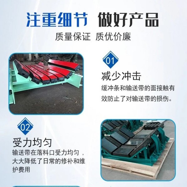 緩沖床用于落料點(diǎn)代替普通緩沖托輥,能有效避免尖銳物體插入膠帶從而防止撕裂膠帶。整體托住膠帶,落料時(shí)膠帶不會(huì)凹陷,有效導(dǎo)正落料,防止膠帶跑偏,防止物料溢出。整體承受物料沖擊,相對(duì)于單個(gè)承受沖擊緩沖托輥,壽命大大提高。