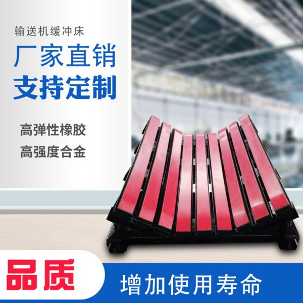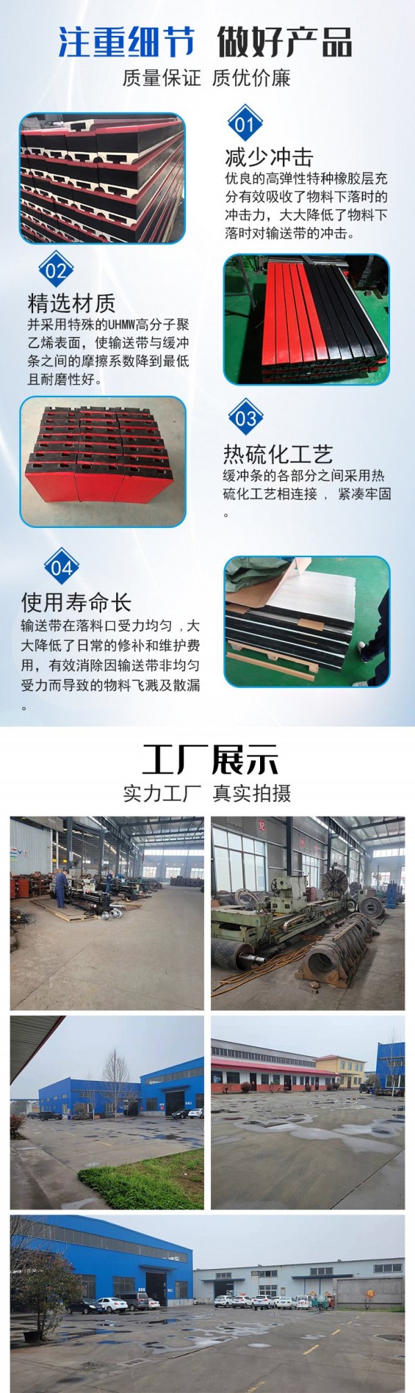 緩沖條上的白板具有較低的摩擦系數(shù),滑動運(yùn)行阻力很小。具有很高的耐磨性,經(jīng)久耐用,具有較高的抗拉強(qiáng)度和抗沖擊強(qiáng)度。黑板富有彈性和柔韌性,能很好的吸收沖擊能量,極大的減輕物料下落時對皮帶的沖擊。山東美奐橡塑