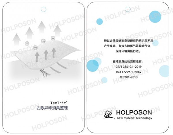 HOLPOSON? Hulk 是我司東華大學博士團隊開發的紡織品消臭整理劑,能夠有效吸附氨、硫化氫、三甲胺、甲基硫醇以及苯酚,氧化氮、醛類等有刺激氣味的臭氣,具有良好的凈化異味氣體功能,為適用人群營造舒適清新安全的生活環境。消臭整理劑HOLPOSON? Hulk可以在滌綸,棉,粘膠及混紡織物后整理工藝添加,適用于:家紡、服裝、地毯、窗簾、襪子、車內飾等領域。