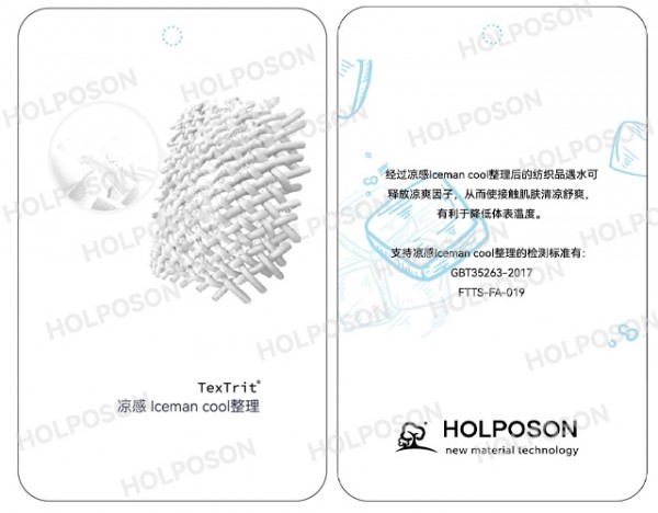 HOLPOSON?ICEMAN COOL也叫酷冰俠?是一款專門針對紡織品開發的涼感功能整理劑,是由我公司的東華大學博士團隊開發的以木糖醇,赤糖醇,絲蛋白為主的接觸吸濕涼感整理劑。適合用于天絲,冰絲,棉,滌綸等各種纖維的后整理。其作用原理:涼感整理劑HOLPOSON? ICEMAN COOL處理在面料表面的木糖醇遇水發生吸熱反應,釋放涼爽因子從而使接觸到涼爽因子的皮膚清涼舒爽,另外其所含有的絲蛋白成分具有良好的保濕功能,清涼保濕雙組合使得人們在炎炎的夏日有降溫防護的可能。