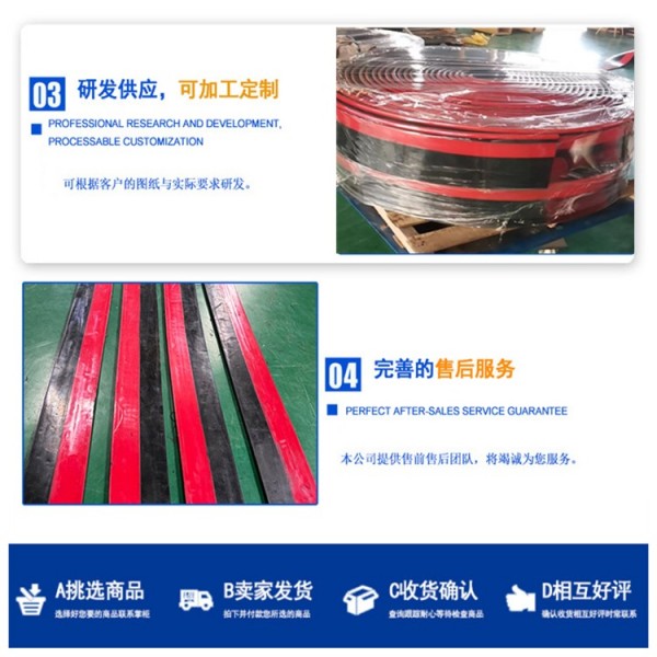 1. 防溢裙邊的主體部分為黑色,采用 橡膠和丁苯橡膠混煉而成,在保持挺括的基礎上增加彈性,使紅色的多防護密封條緊密的貼服在輸送帶上,甚至當多護系統達到使用即將磨損完后還能夠繼續履行防溢裙邊的防溢效果。