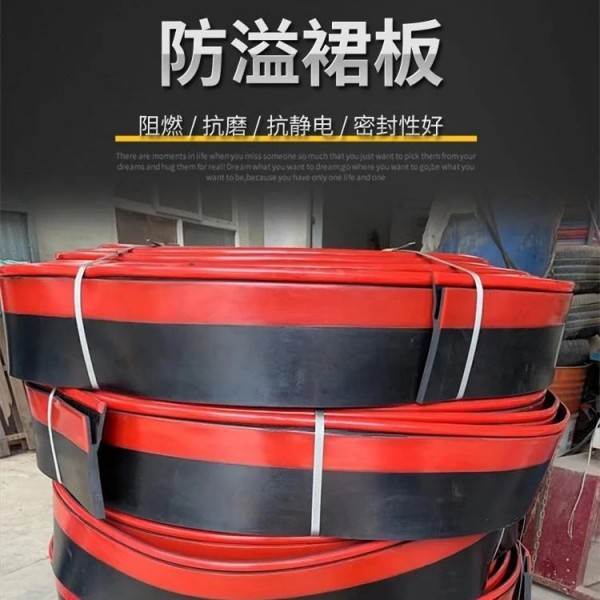 2、防溢裙板高度可根據導料槽的實際尺寸適當調整。采用了橡膠添加半凝固潤滑劑的方式,解決了以往防溢裙邊高的同時,容易損傷皮帶的難題。該材質質地柔韌,彈性優良,避免了聚氨酯(PU)不耐水的缺點,高的同時不損傷輸送帶。
