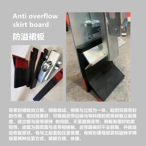 3. 雙層防護防溢裙板,導料槽密封系統,Y型固定膠塊,裙邊主體采用一次性一體熱硫化方式制成,結構緊湊有效,結實。背面的型固定膠塊可根據客戶要求在制作的過程中去掉,以適應過去老的安裝。