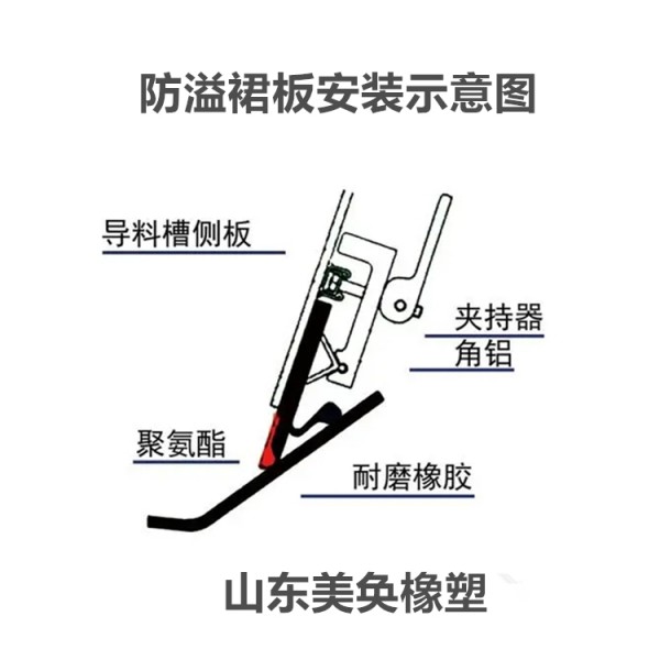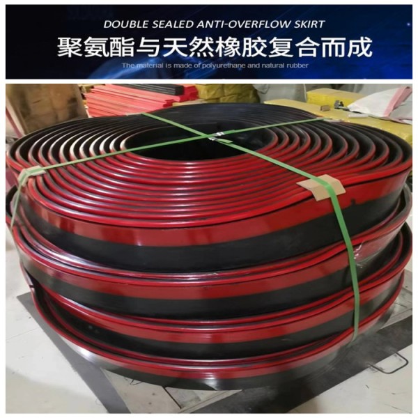 2、防溢裙板高度可根據導料槽的實際尺寸適當調整。采用了橡膠添加半凝固潤滑劑的方式,解決了以往防溢裙邊高的同時,容易損傷皮帶的難題。該材質質地柔韌,彈性優良,避免了聚氨酯(PU)不耐水的缺點,高的同時不損傷輸送帶。