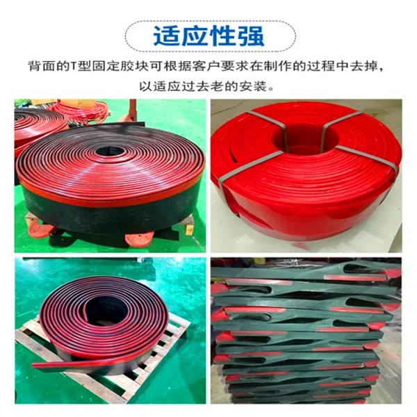 防溢裙邊的主體部分為黑色,采用優質進口天然橡膠和丁苯橡膠混煉而成,在保持挺括的基礎上增加彈性,使綠色的多護密封條緊密的貼服在輸送帶上,甚至當多護系統達到使用壽命后能夠繼續履行防溢裙邊的職責,保護使用廠商的投資。多護防溢系統,T型固定膠塊,裙邊主體采用一次性一體熱硫化方式制成,結構緊湊有效,結實耐用。背面的T型固定膠塊可根據客戶要求在制作的過程中去掉,以適應過去老的安裝方法。