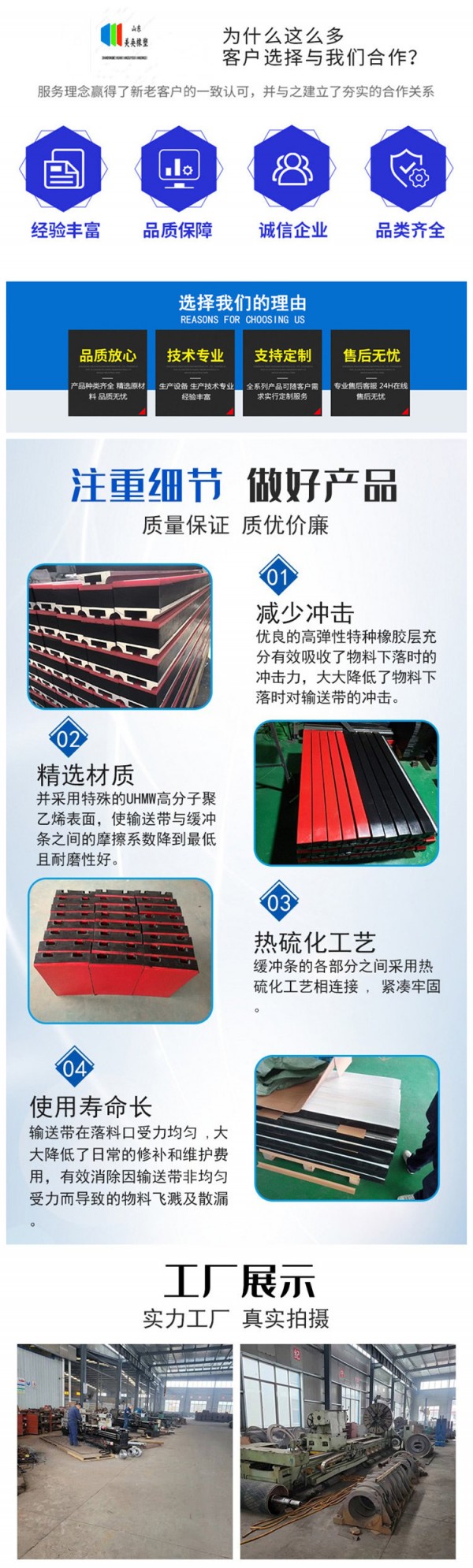 我們廠緩沖條耐磨層采用UHMW聚乙烯板材,自潤滑性能好,摩擦系數小,耐磨性能好,使用壽命長,