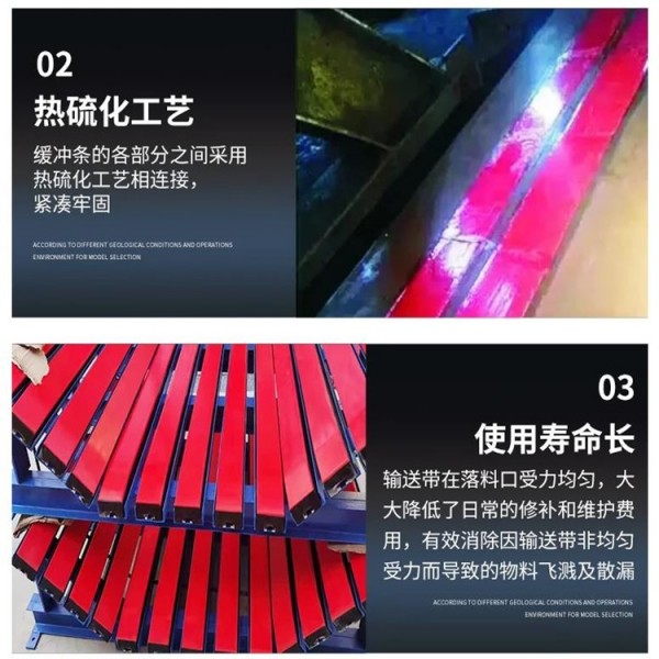 緩沖條是用于輸送機的進料口處,替代傳統(tǒng)的緩沖托輥,高能吸收和低摩擦地緩解進料端落料的沖擊力,輸送條和輸送帶的面接觸有效防止了對輸送帶的損傷。